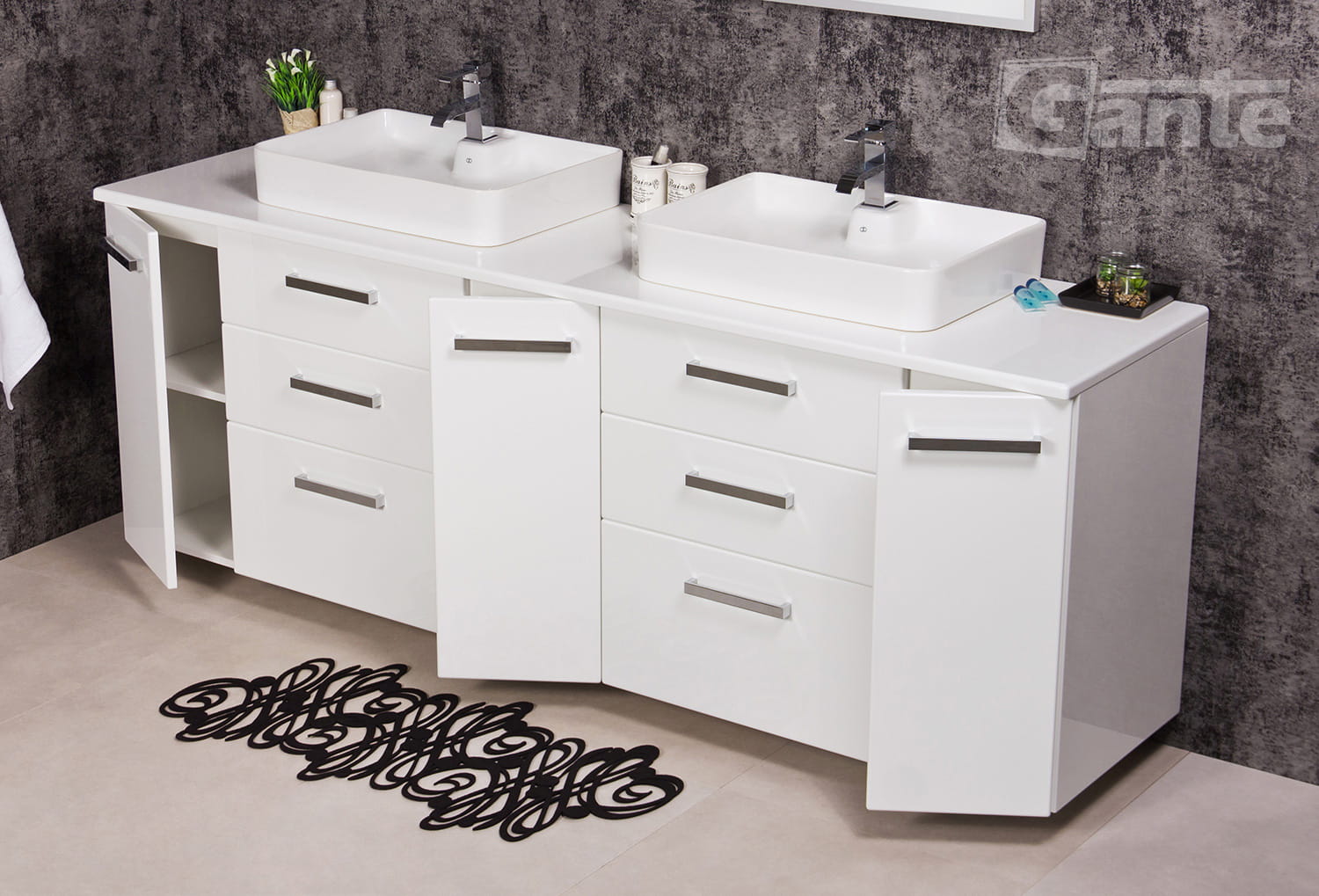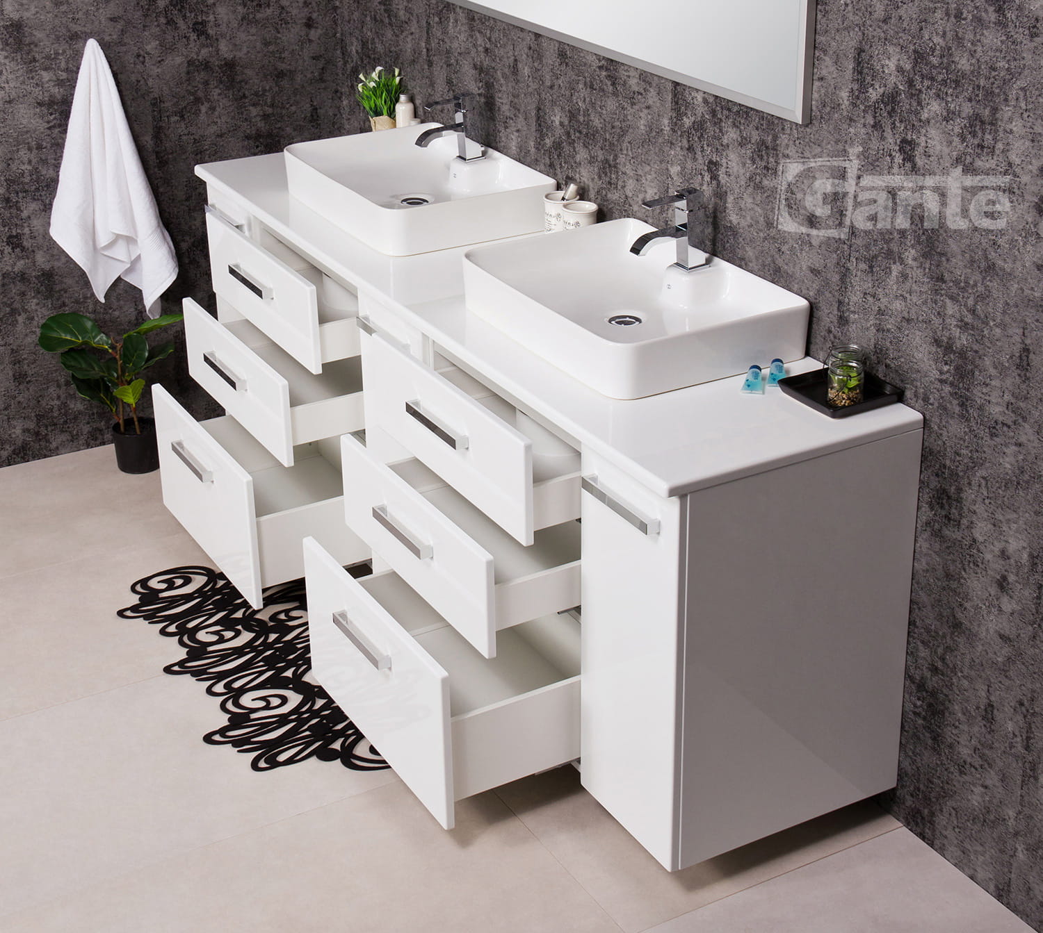- 6 pojemnych szuflad z opcją pełnego wysuwu pomieści dużo łazienkowych akcesoriów