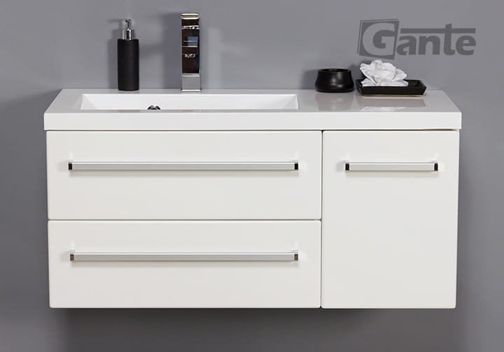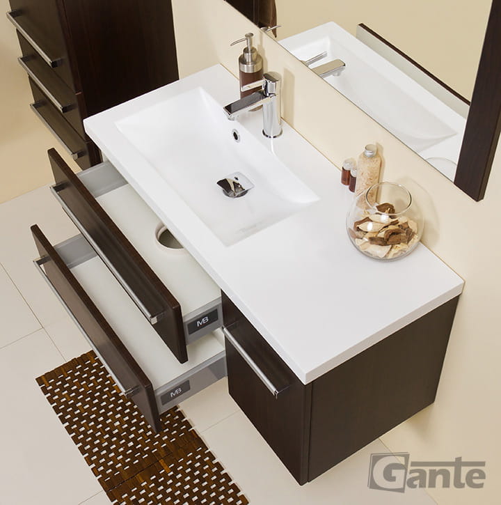 Szafka pod umywalkę wyposażona jest w system cichego domykania. Są to pneumatyczne prowadnice firmy GTV z opcją pełnego wysuwu, które zapewniają:
