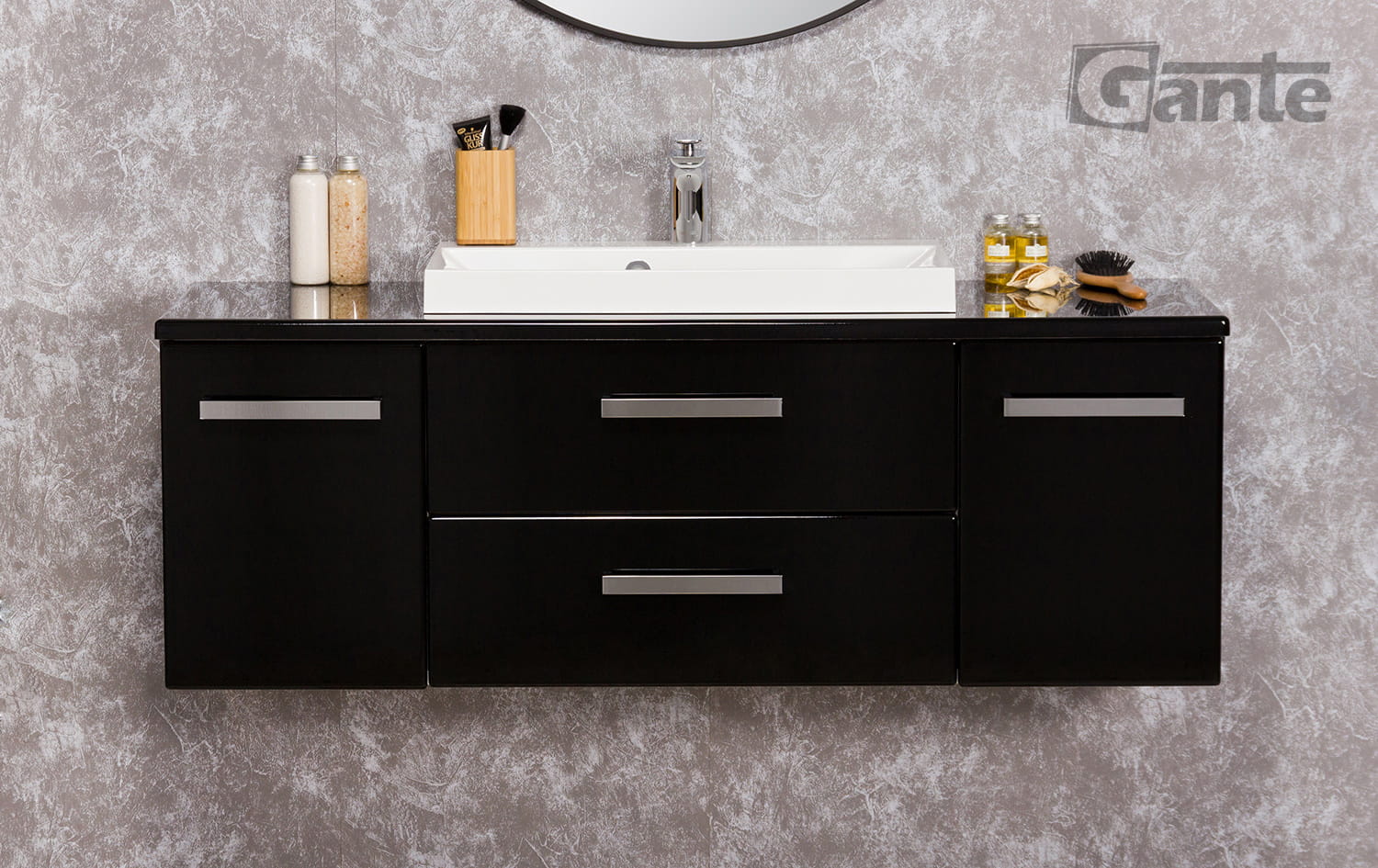 Czarna, klasyczna szafka do łazienki z czarnym blatem i umywalką nablatową z niskim rantem - kompleksowe rozwiązanie do Twojej łazienki