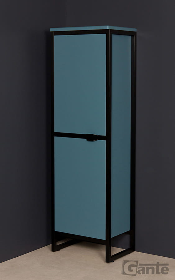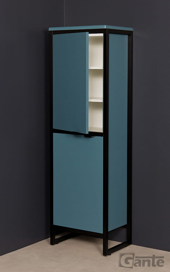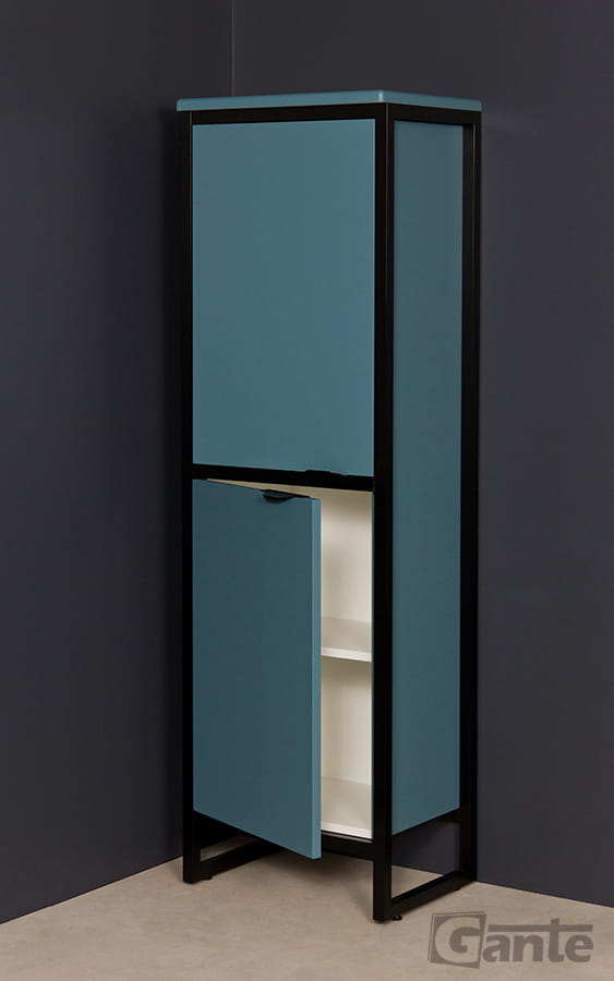 Regał podzielony jest na 2 części z których każda otwiera się oddzielnie. Matowe wykończenie pozwala utrzymać mebel w czystości, nie widać na nim odcisków palców które często są widoczne na połyskujących wykończeniach. Aluminiowy stelaż w czarnym macie utrzymuje konstrukcję mebla nadając mu wyjątkowo industrialnego charakteru.