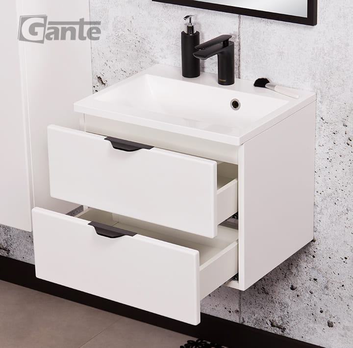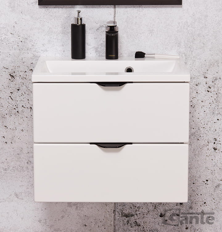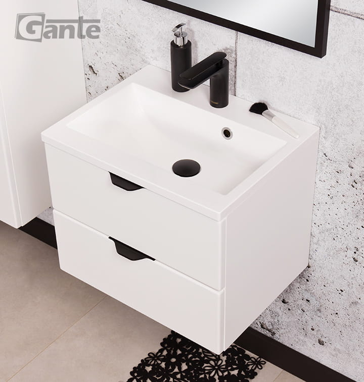 Szafka pod umywalkę 50 cm biały mat z czarnymi uchwytami a do tego zgrabna umywalka - duet idealny do stworzenia modnej łazienki