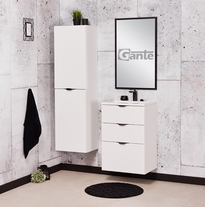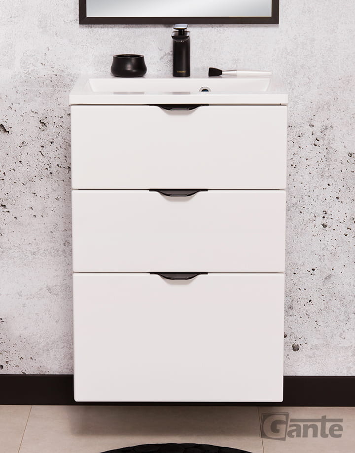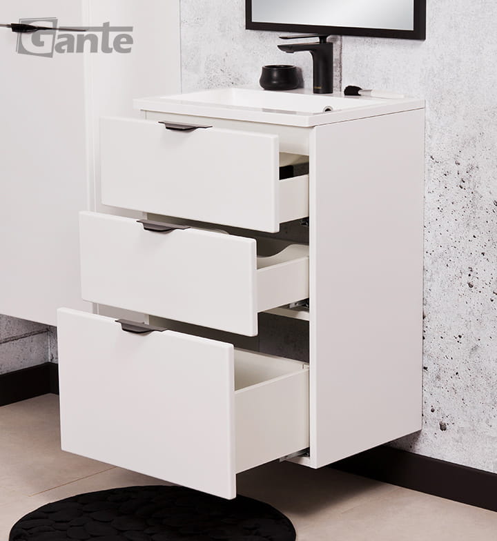 Szafka pod umywalkę 50 cm biały mat z czarnymi uchwytami a do tego zgrabna umywalka - duet idealny
