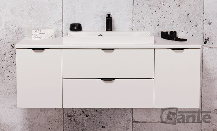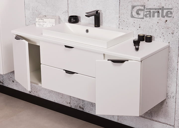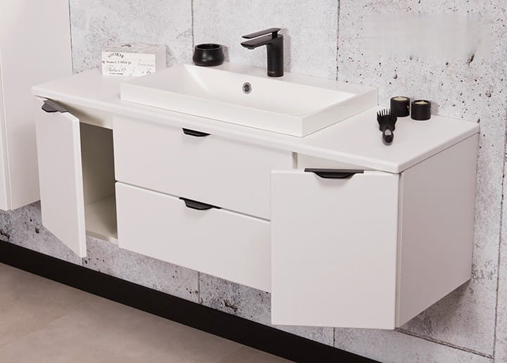 Szafka pod umywalkę 120 cm biały mat z czarnymi uchwytami a do tego duży blat i zgrabna umywalka - trio idealne