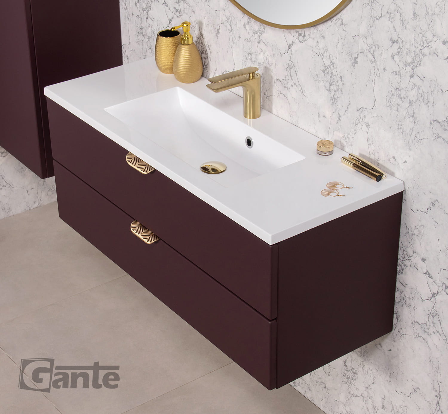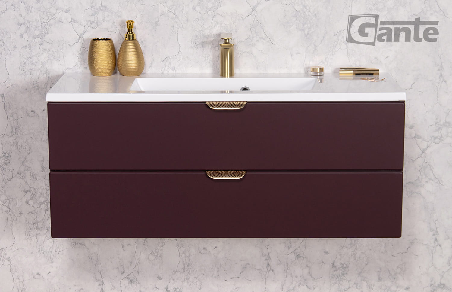 Bordowa szafka do łazienki ze złotymi uchwytami o szerokości 100 cm to świetny pomysł na umeblowanie Twojego wnętrza