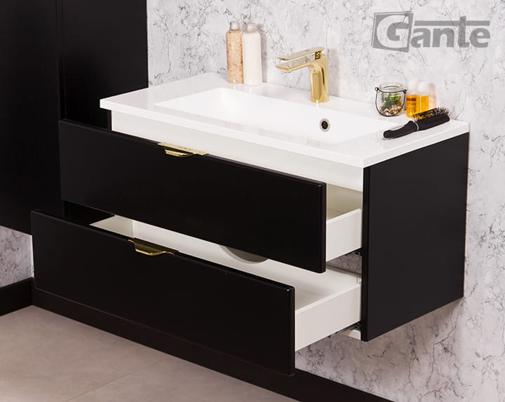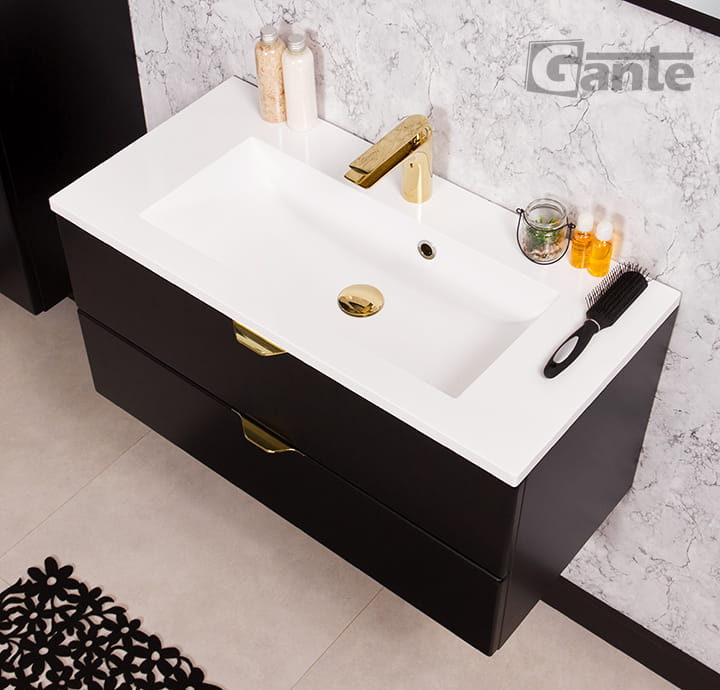 Szafka pod umywalkę 80 cm czarny mat ze złotymi uchwytami a do tego zgrabna umywalka - duet idealny