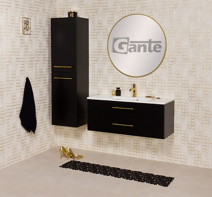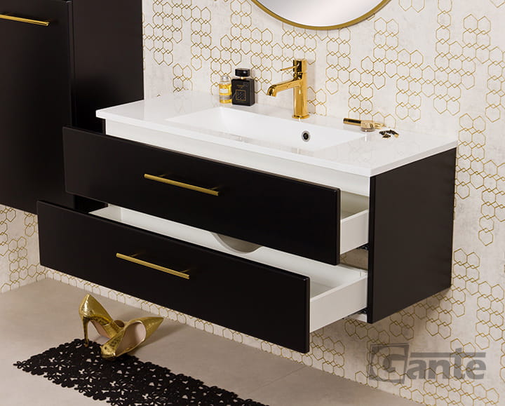 Czarna szafka łazienkowa Belli Gold 100 cm ze złotymi uchwytami + umywalka