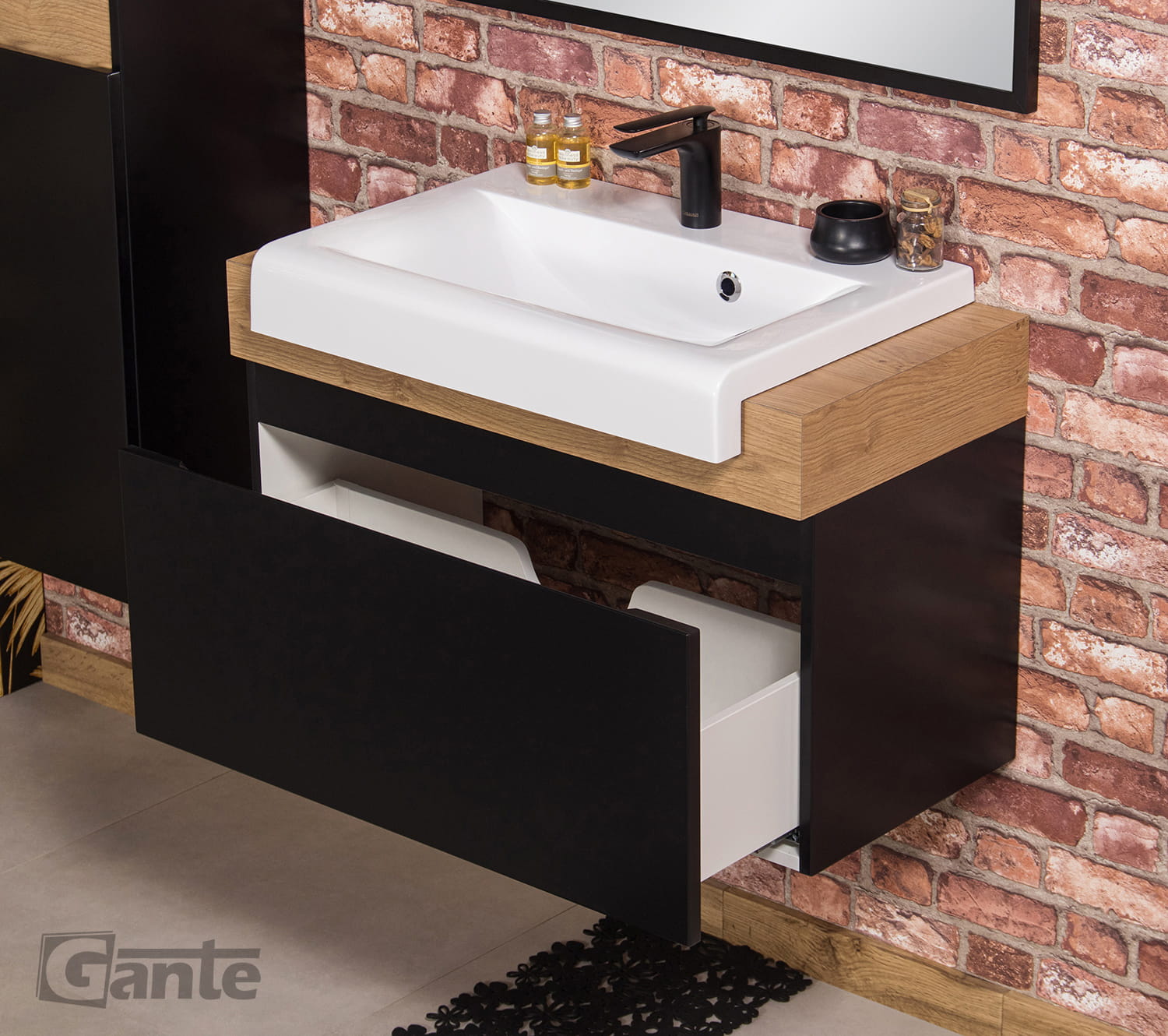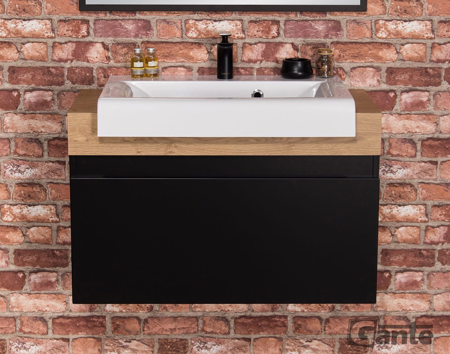 Czarna szafka pod umywalkę 80 cm z grubym blatem w dekorze dębu z umywalką