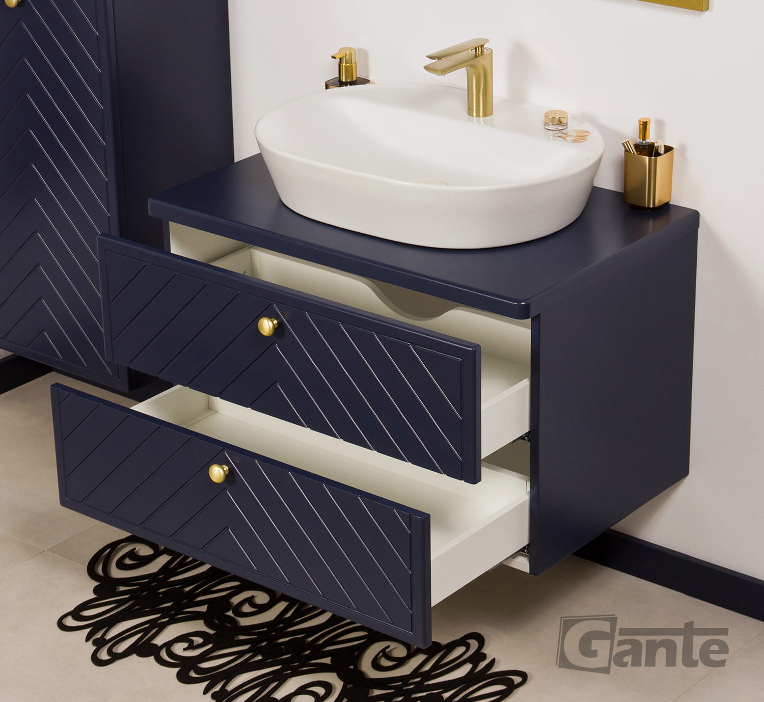 - 2 pojemne szuflady idealnie spasowane frontami tworzą wzór jodełki z precyzyjnie wymierzonymi frezowaniami - takie dopasowanie stworzy tylko profesjonalny producent mebli łazienkowych