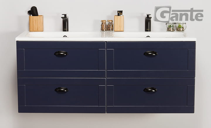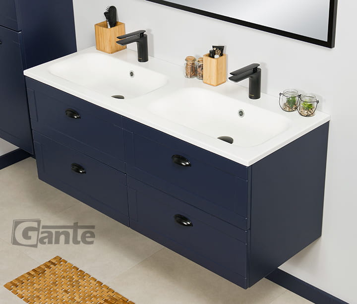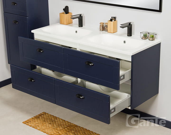 Granatowa szafka pod umywalkę 121 cm Grend + podwójna umywalka