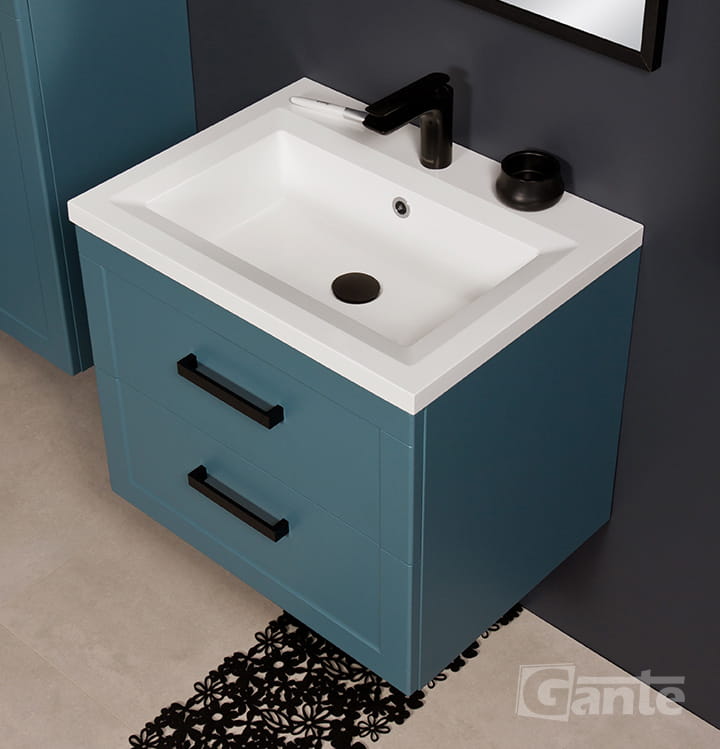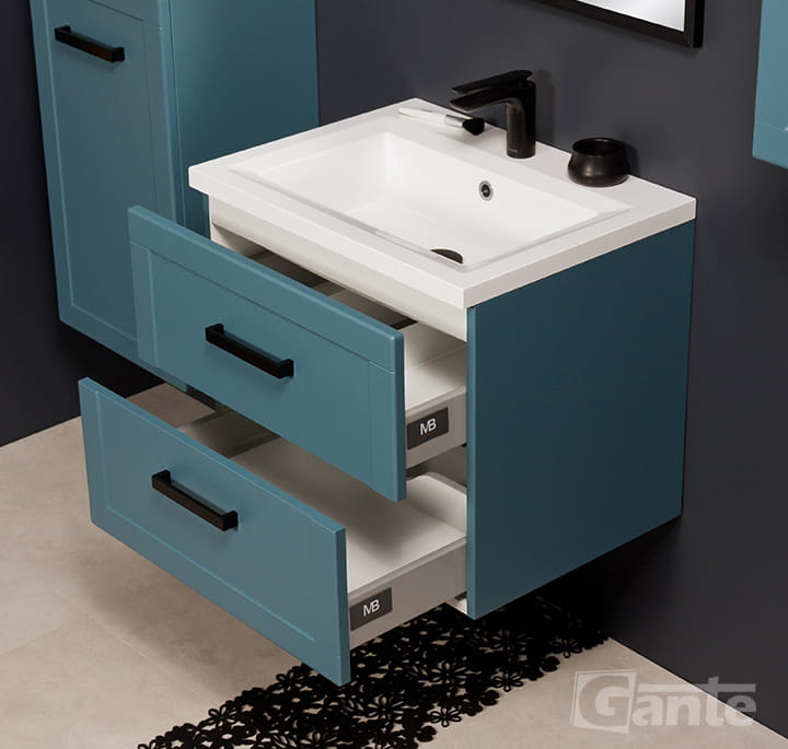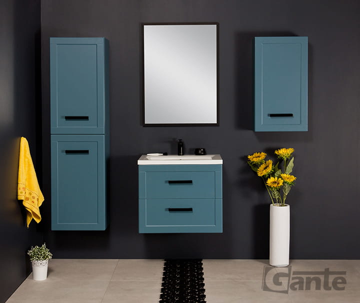 - niebieska komoda jest praktycznym rozwiązaniem do nowoczesnych łazienek, którym chcemy nadać wyjątkowego charakteru.