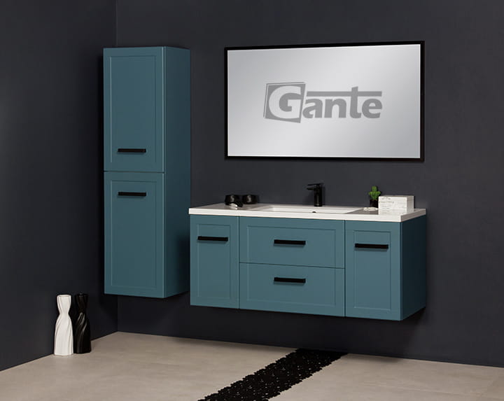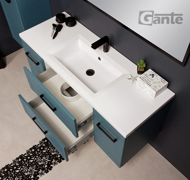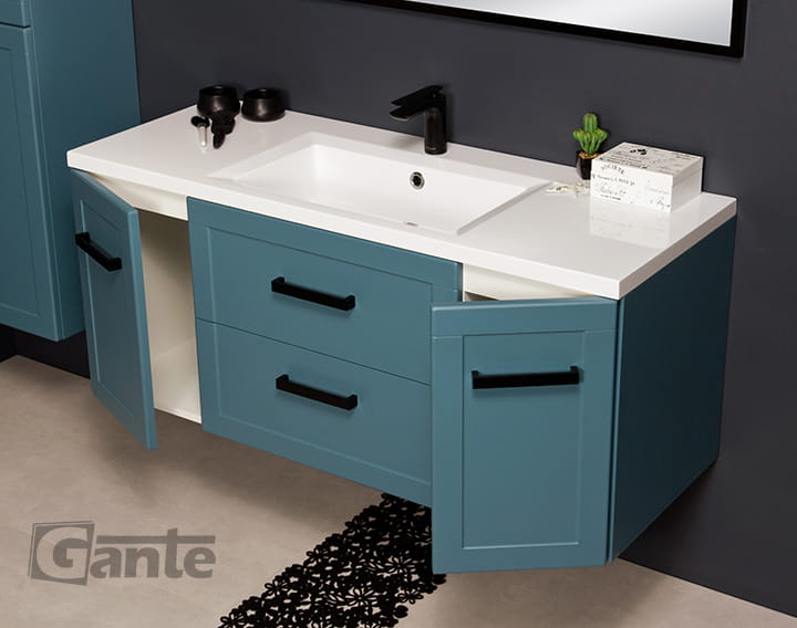 - niebieska komoda z 2 szufladami jest praktycznym rozwiązaniem do nowoczesnych łazienek, którym chcemy nadać wyjątkowego charakteru.