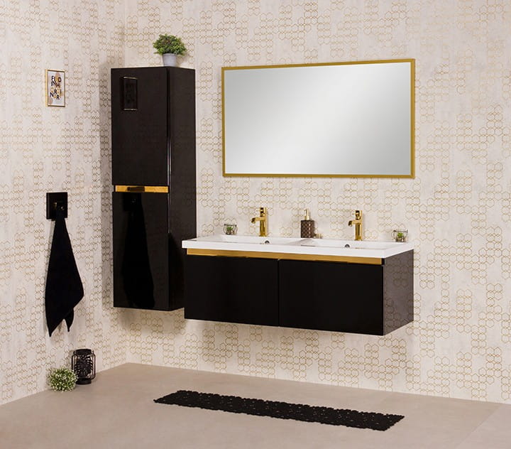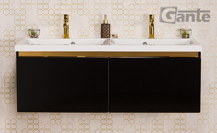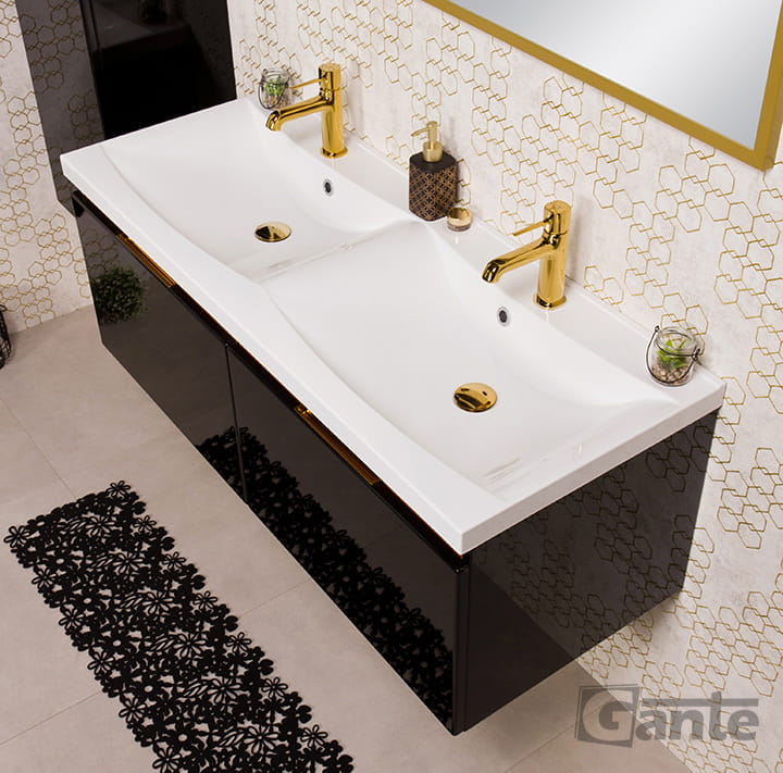Podwójna czarna szafka Diamond ze złotym uchwytem i umywalką 120 cm