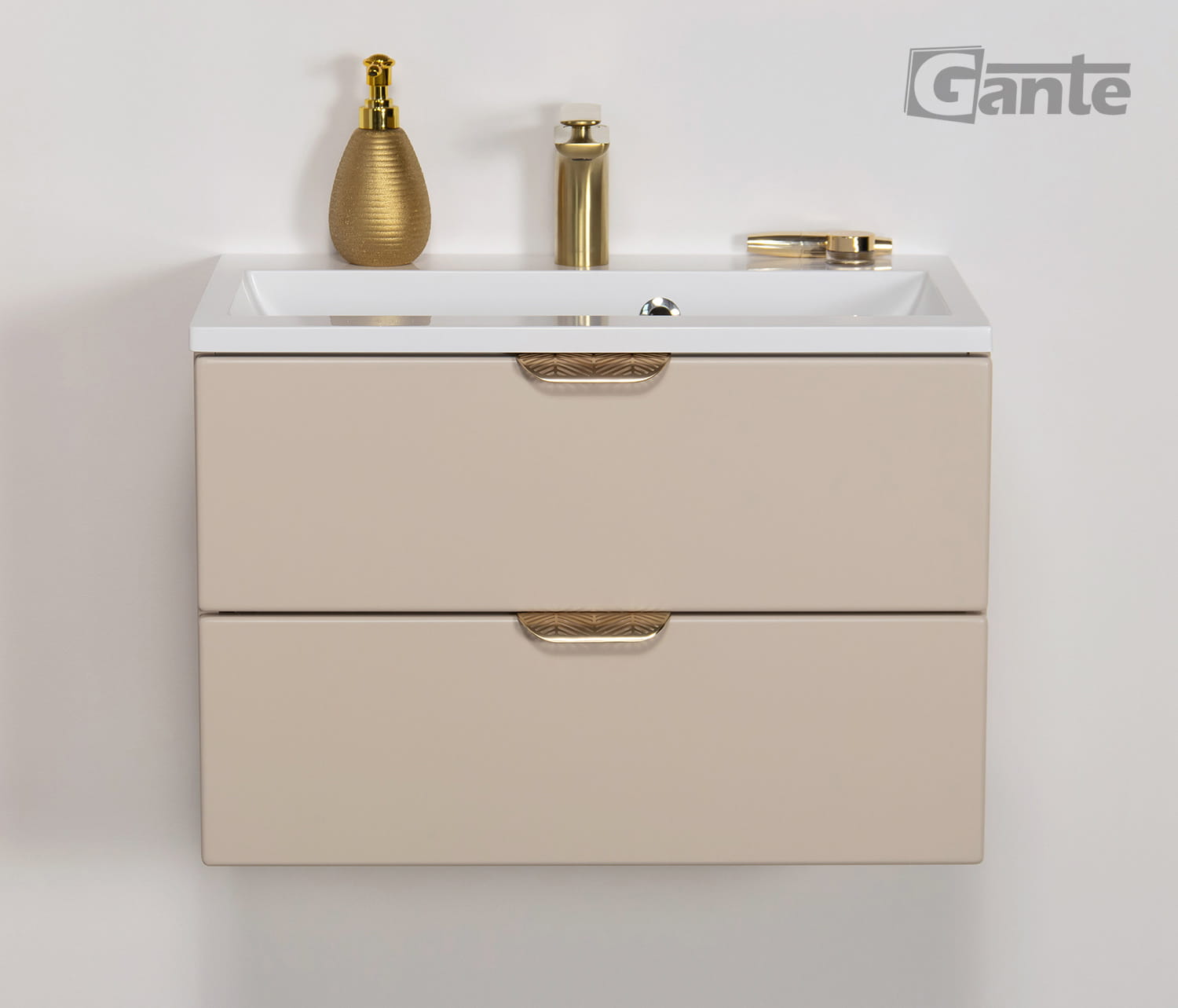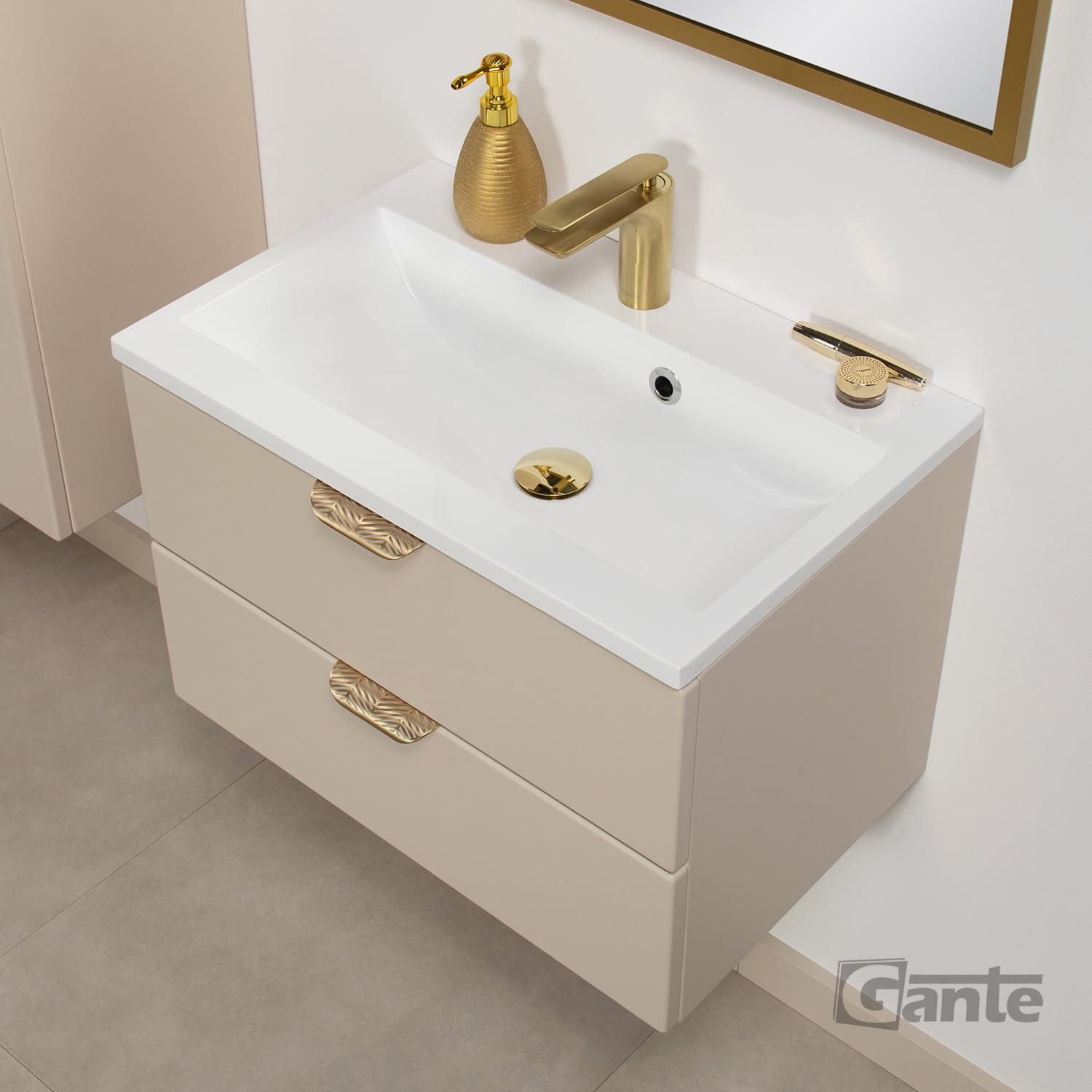 • beżowe szafki do łazienki • szafki ze złotymi uchwytami