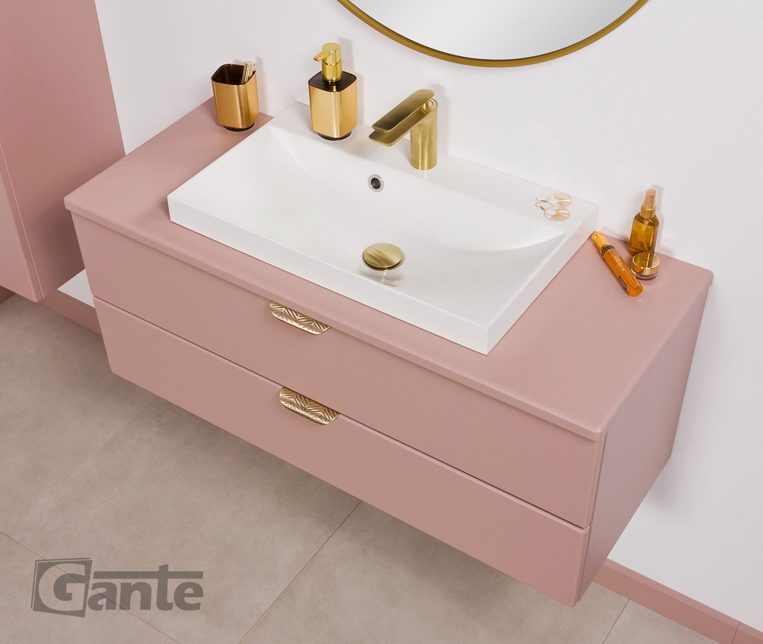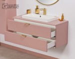 - różowe, matowe wykończenie frontów i boków to zasługa profesjonalnej folii meblowej przeznaczonej dla przemysłu meblarskiego. Dzięki temu powierzchnia mebli jest odporna na łazienkowy mikroklimat i długo będzie służyła nie tracąc swoich walorów wizualnych i użytkowych