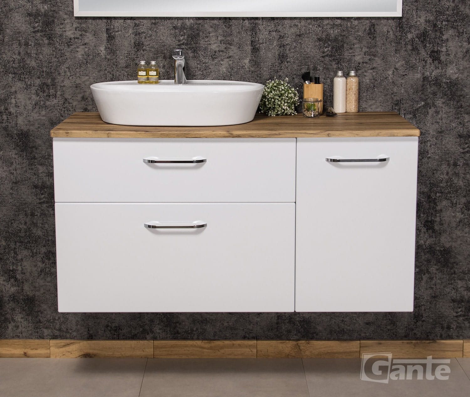 Ten zestaw to połączenie szafki z szufladami 80 cm + szafki z koszem 40 cm + blatu 120 cm + umywalki nablatowej