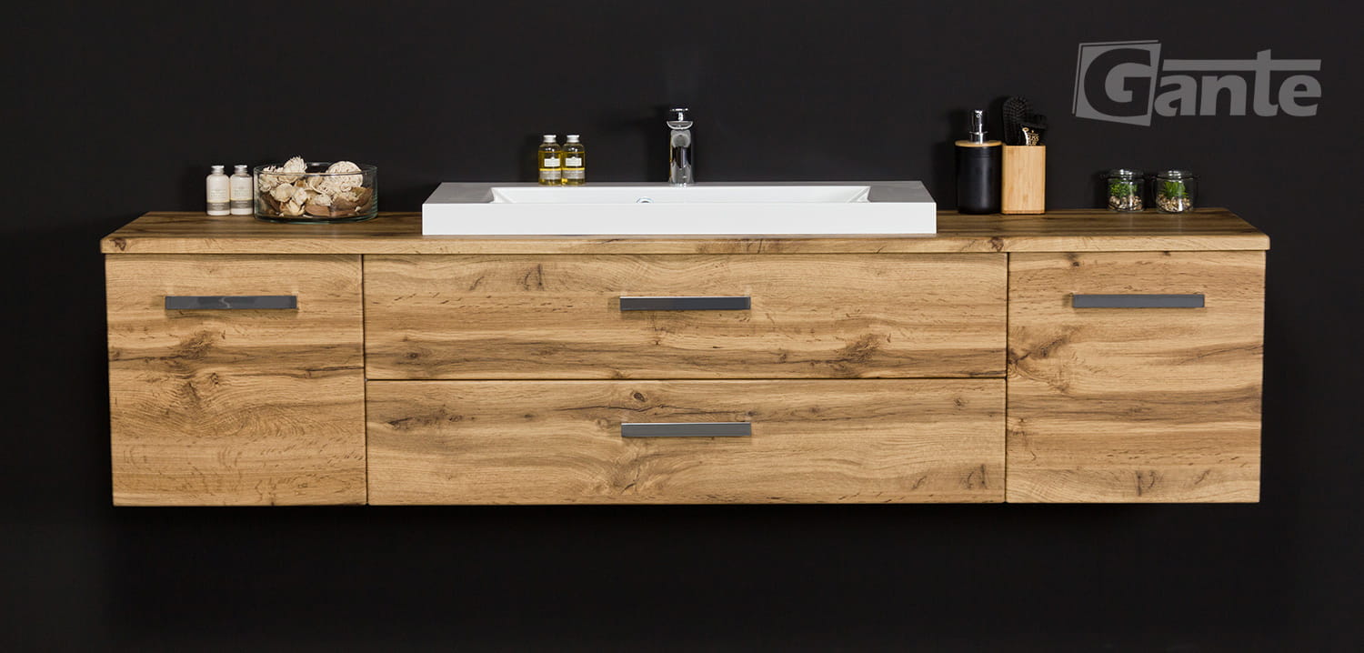 Szafka łazienkowa 180 cm z blatem w dekorze drewna i umywalką nablatową