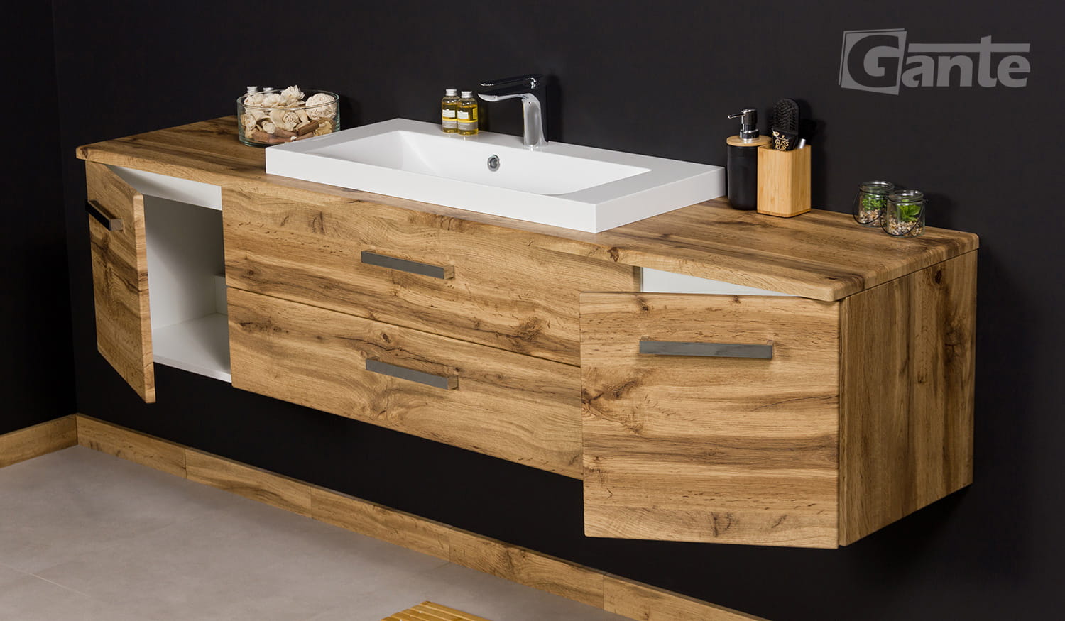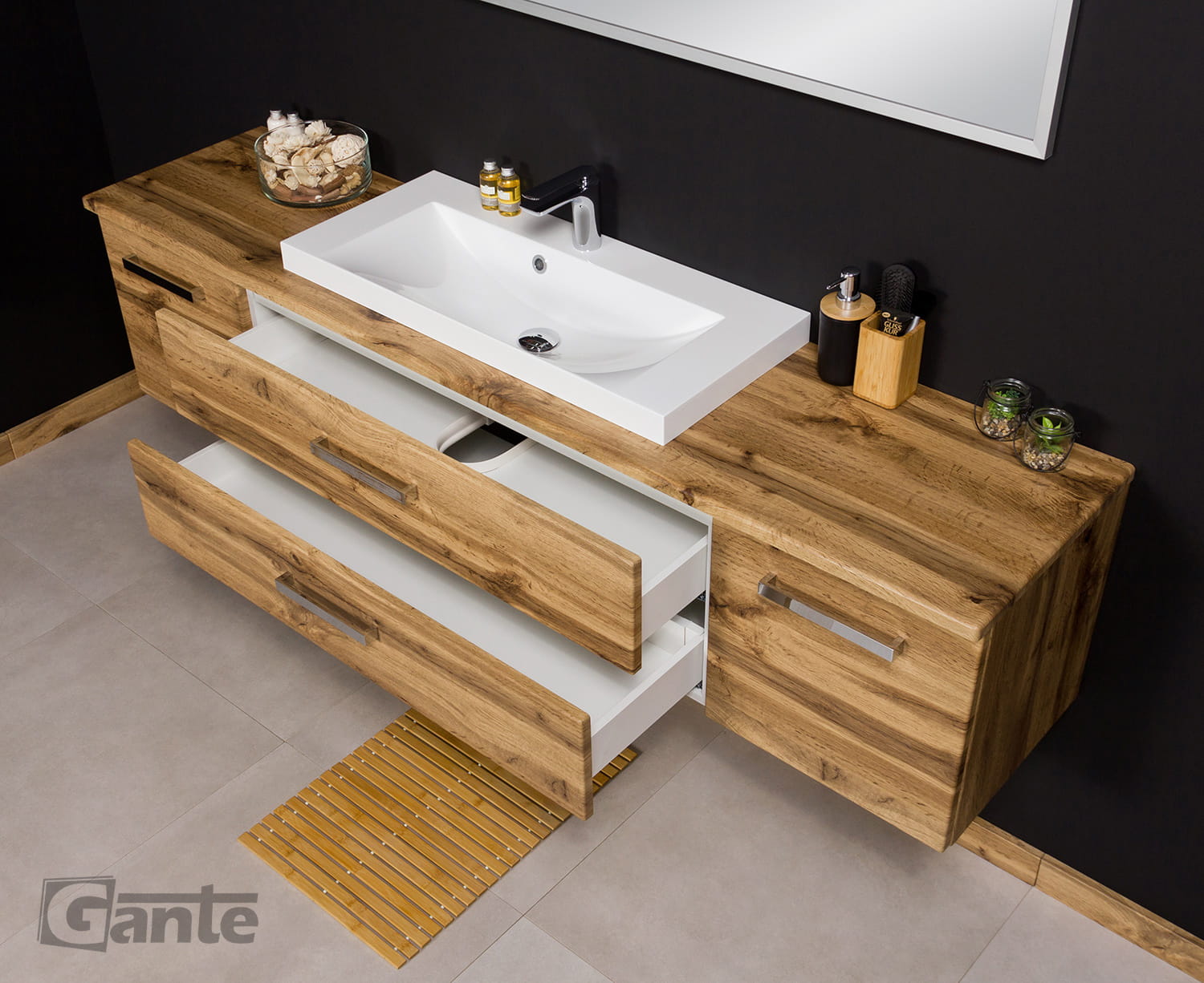 - Wyposażona w dwie pojemne szuflady o wysokości 20 cm z pełnym wysuwem, które pomieszczą wszystkie łazienkowe niezbędniki.