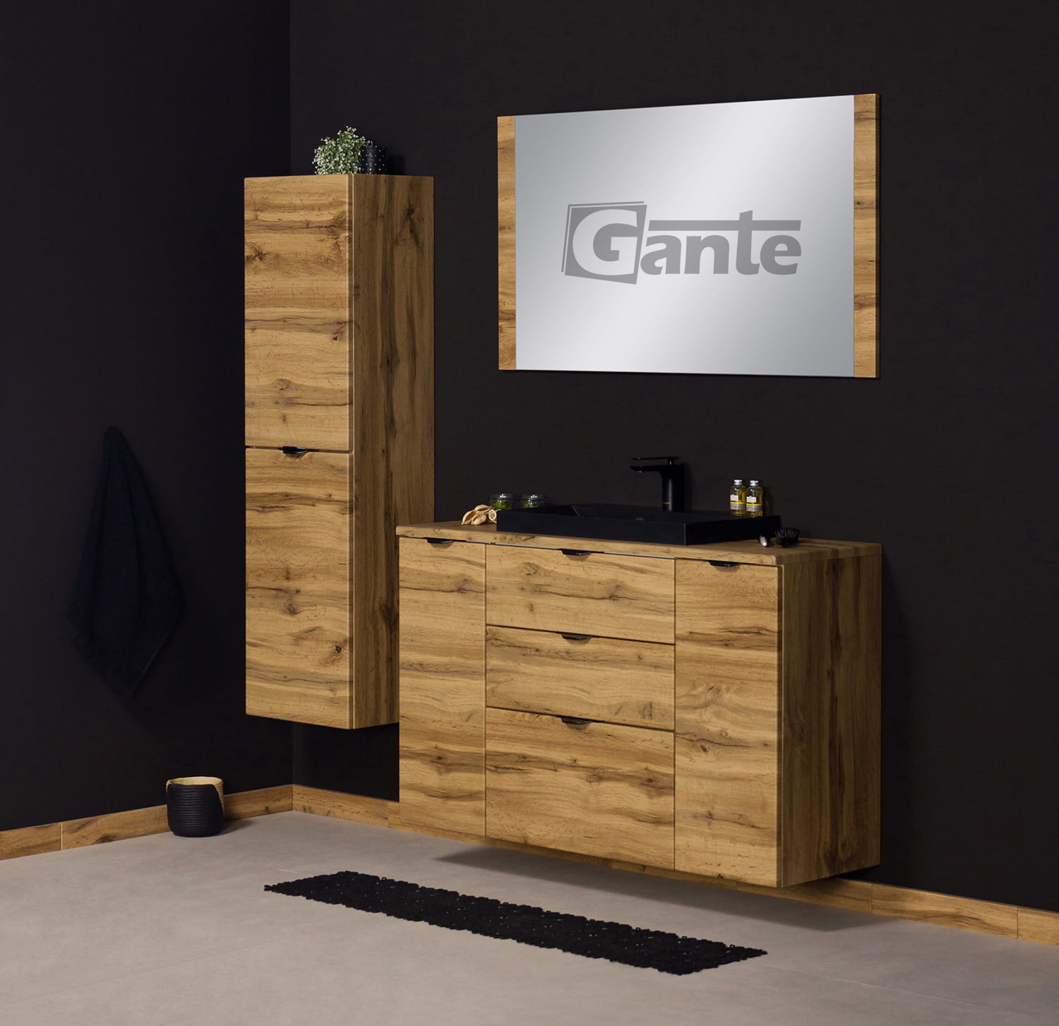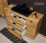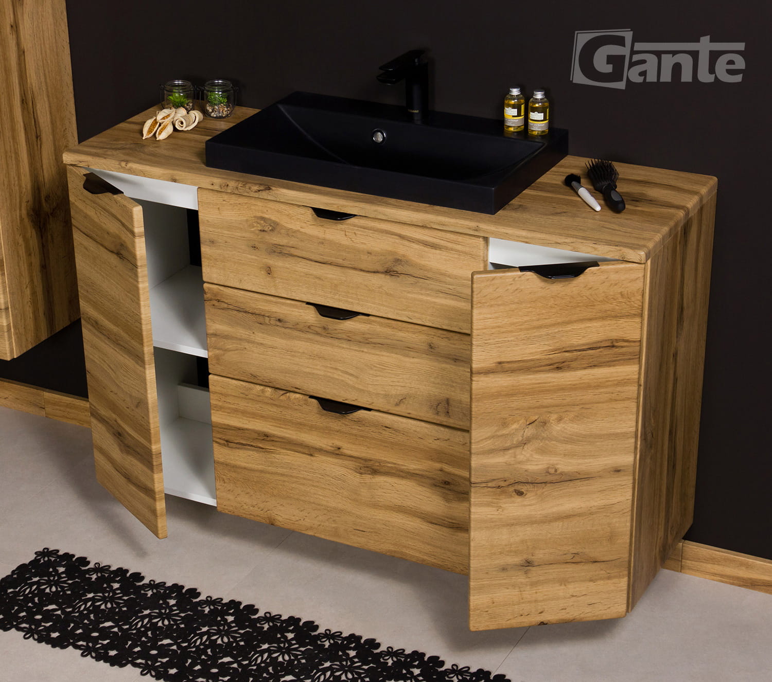 - Matowe wykończenie i usłojenie naturalnego drewna blatu, frontów i boków szafki sprawia, że ten mebel staje się dekoracją wielu łazienkowych wnętrz.