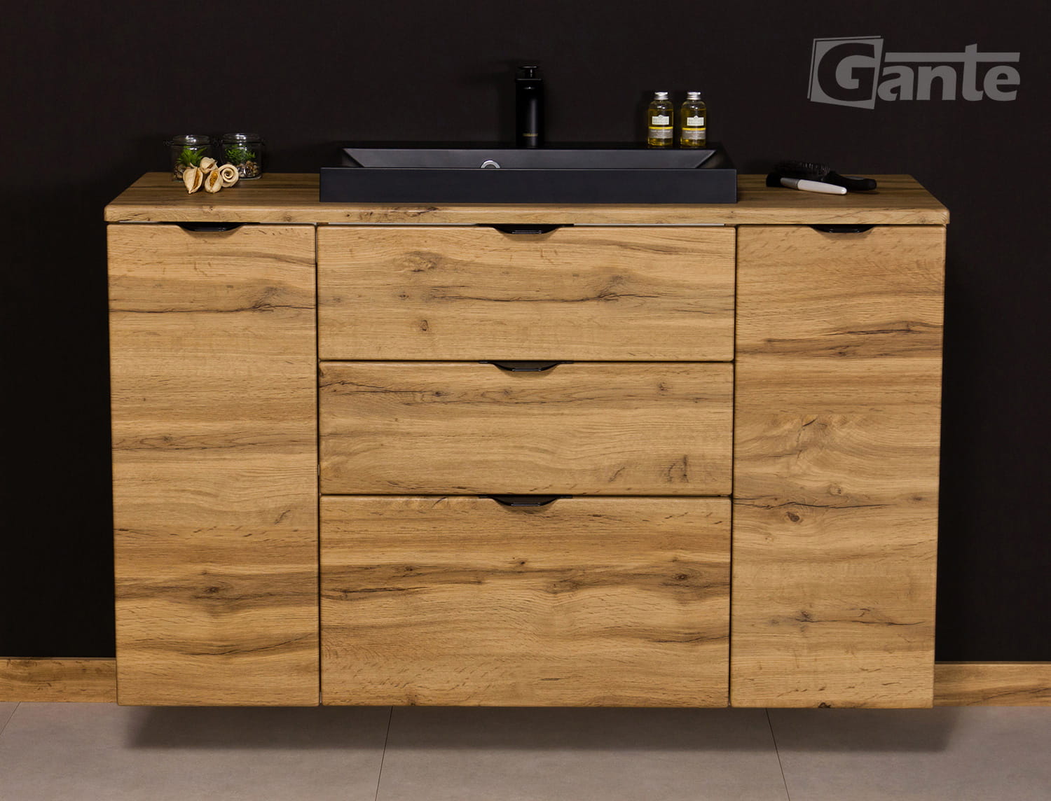 Wisząca szafka łazienkowa z blatem w dekorze dębu i umywalką nablatową w czarnym macie to zestaw, który nada szyku każdemu łazienkowemu wnętrzu