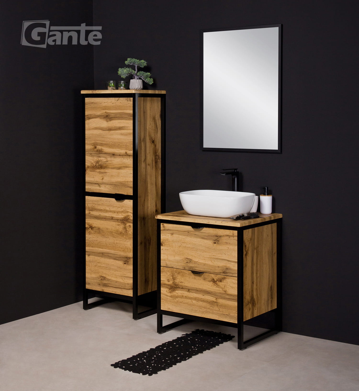 - czarny matowy stelarz tworzy ramę, w którą oprawiona jest komoda łazienkowa