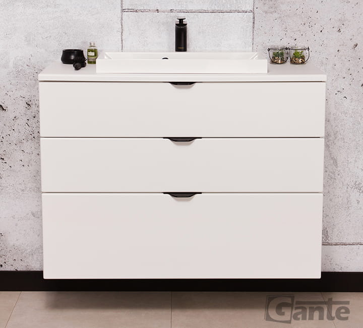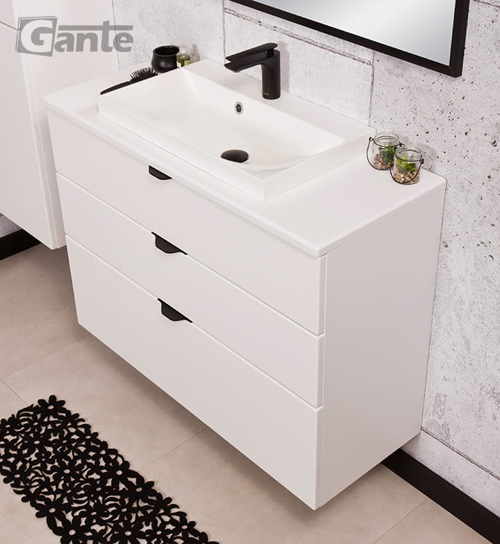 Szafka pod umywalkę 100 cm biały mat z czarnymi uchwytami a do tego elegancka, nablatowa umywalka = duet idealny