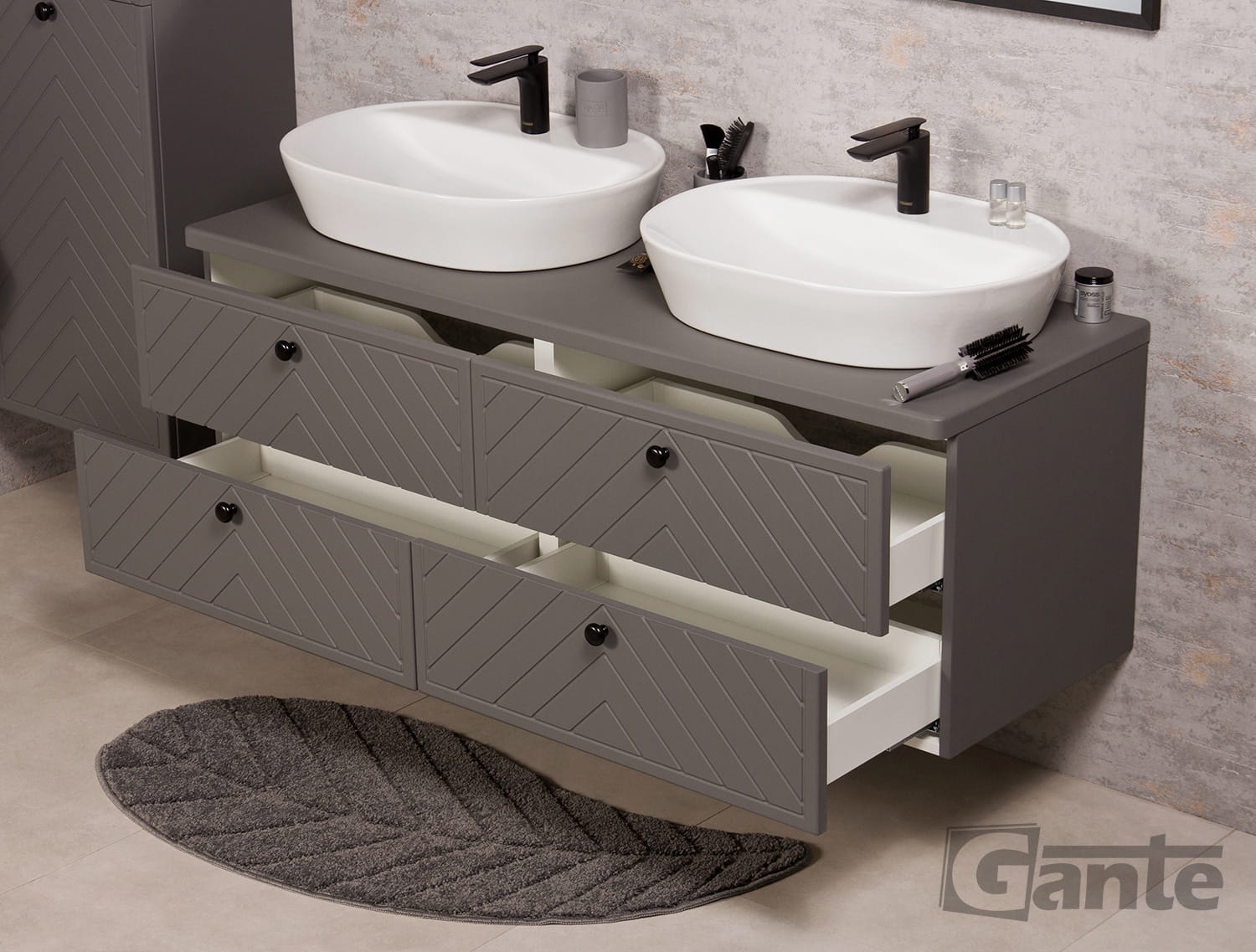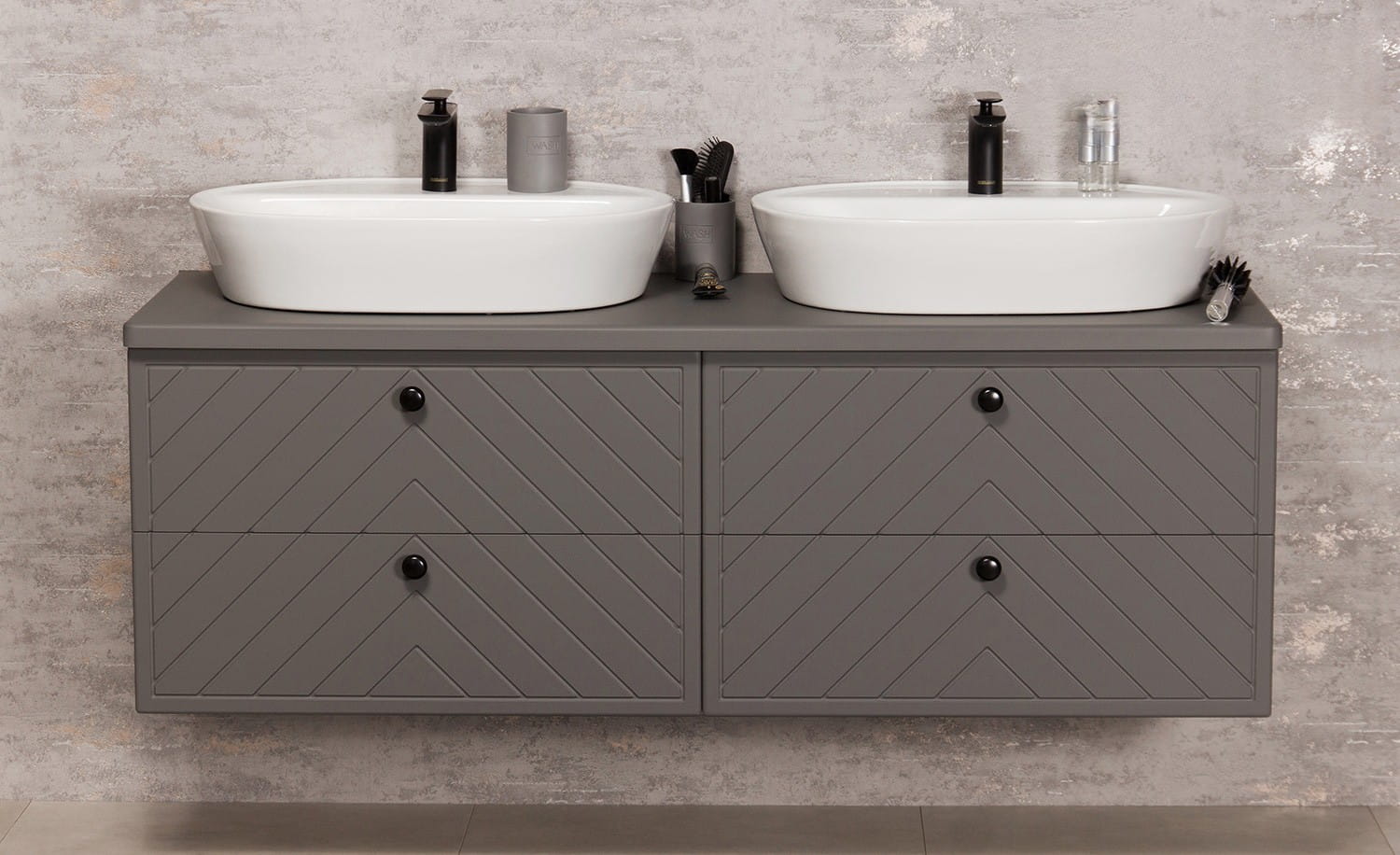 Szafka łazienkowa pod 2 umywalki nablatowe. 4 szuflady z frontami w jodełkę. Kodi zaspokoi potrzeby miłośników modnych mebli łazienkowych