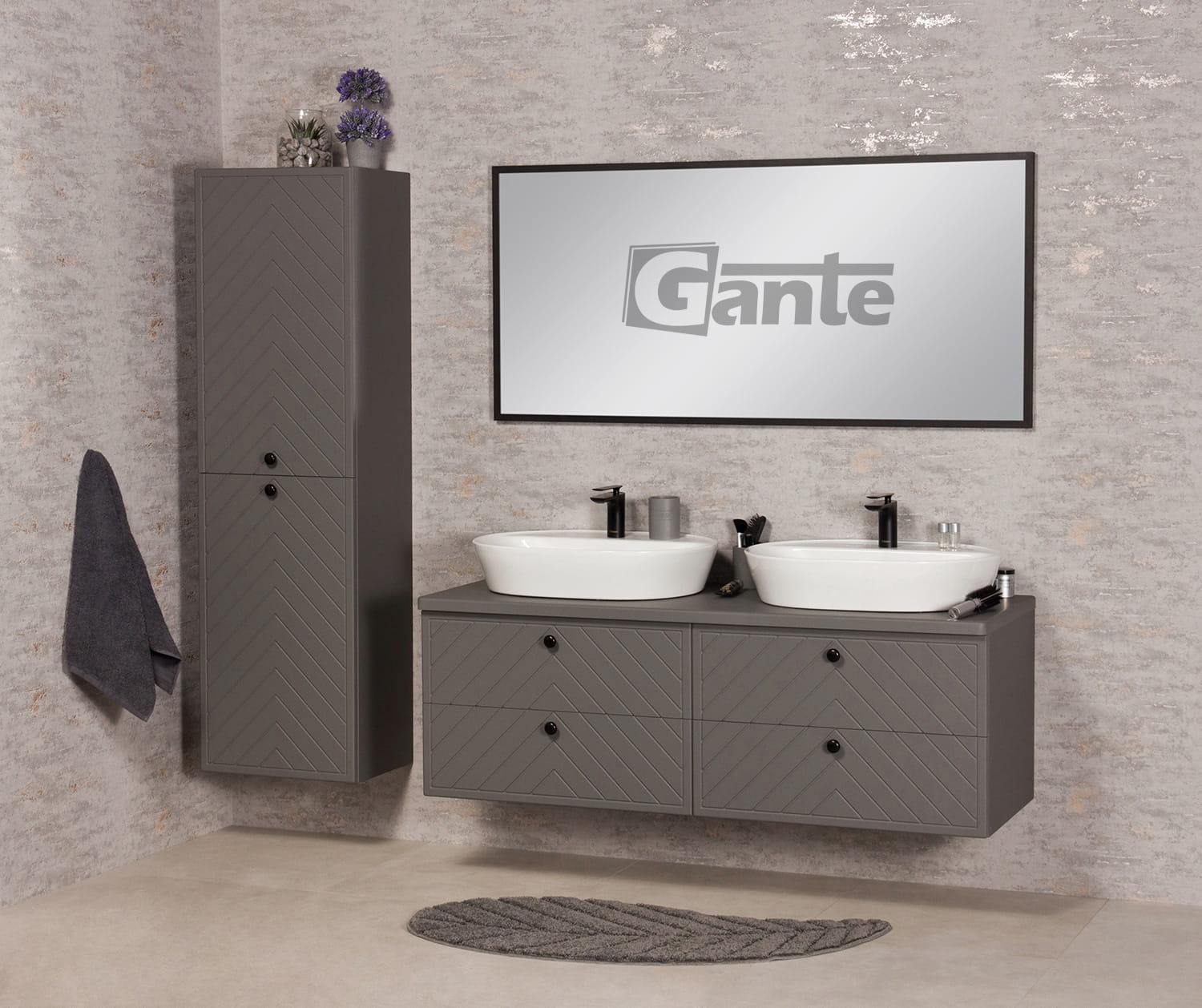 Szara szafka do łazienki z blatem 140 cm pod 2 umywalki nablatowe kolekcja Kodi