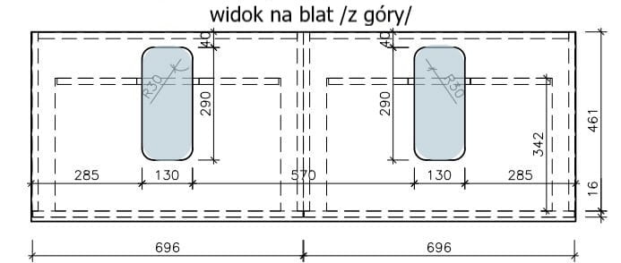 Poniżej rysynek blatu standard: Wymiar otworu pod umywalkę Premium to 29 cm x 13 cm.