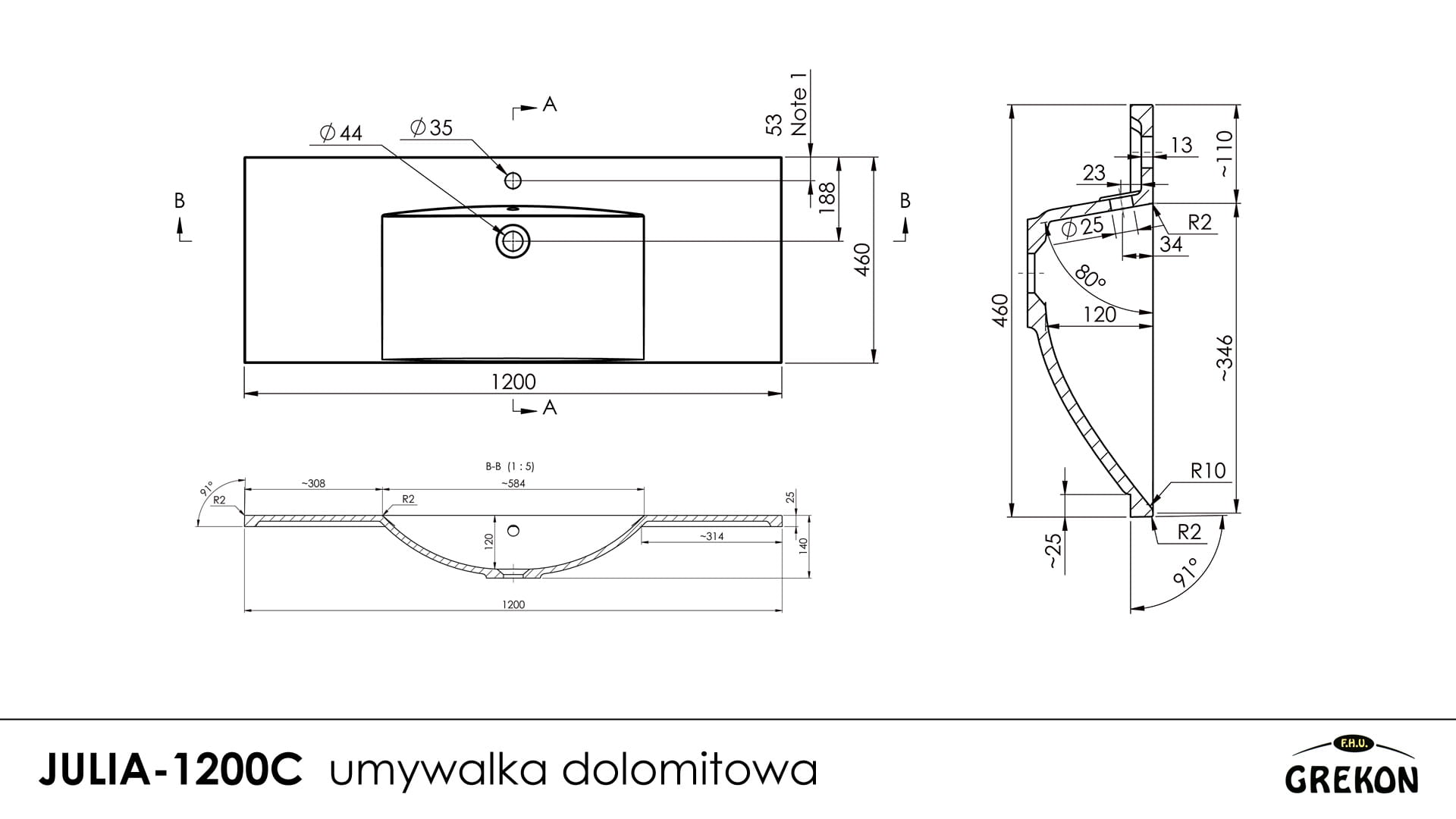 Umywalka 120 cm biały połysk Julia głębokość 46 cm