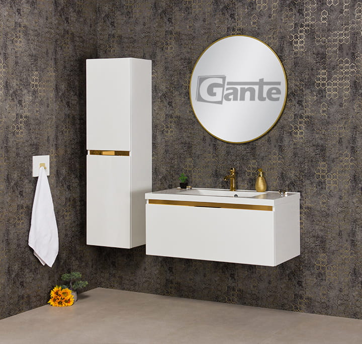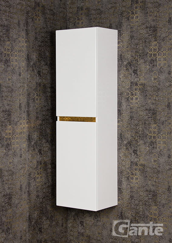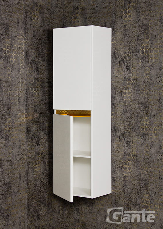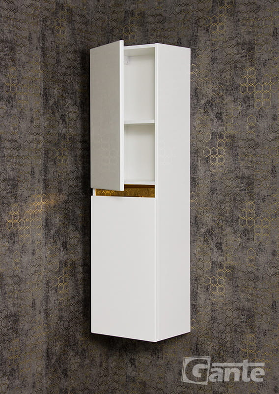 Wiszący regał w białym połysku z błyszczącym złotym dekorem to doskonały pomysł na urządzenie uporządkowanej i eleganckiej łazienki