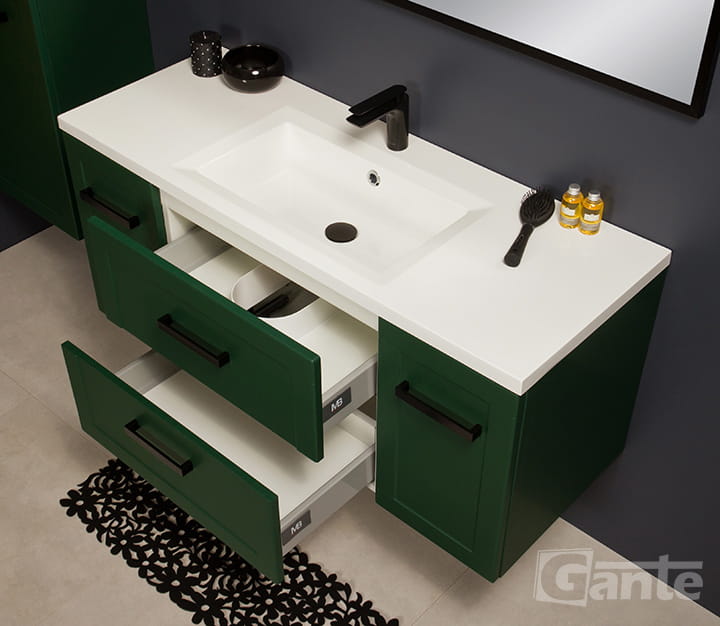 - zielona komoda z 2 szufladami jest praktycznym rozwiązaniem do nowoczesnych łazienek, którym chcemy nadać wyjątkowego charakteru.