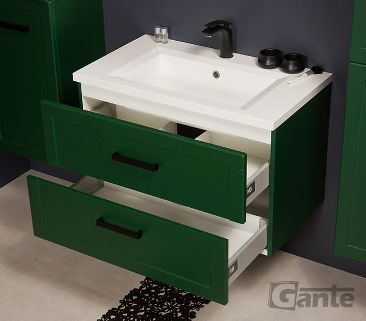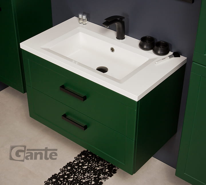 - zielona komoda jest praktycznym rozwiązaniem do nowoczesnych łazienek, którym chcemy nadać wyjątkowego charakteru.