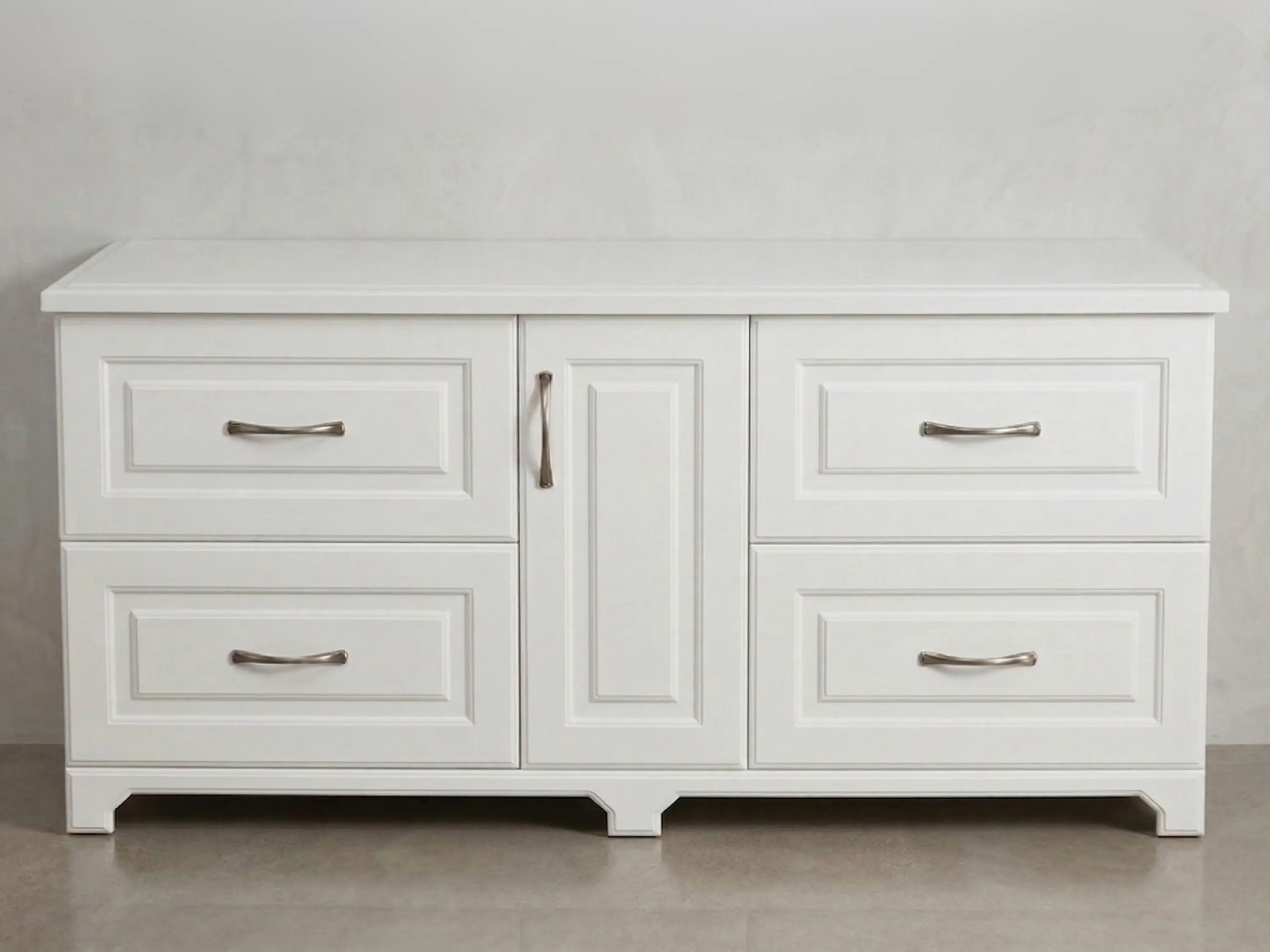 Finezyjnie frezowane fronty szuflad oraz blat nadają tej szafce pod umywalkę wyjątkowego charakteru. Do tego piękne satynowe uchwyty ze zdobieniami nawiązującymi do projektu mebla. Tutaj każda linia jest dokładnie przemyślana i zaprojektowana w celu uzyskania niepowtarzalnego efektu końcowego.